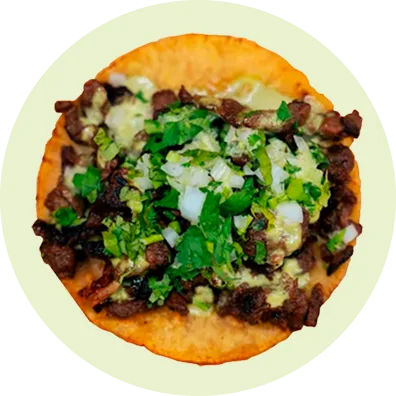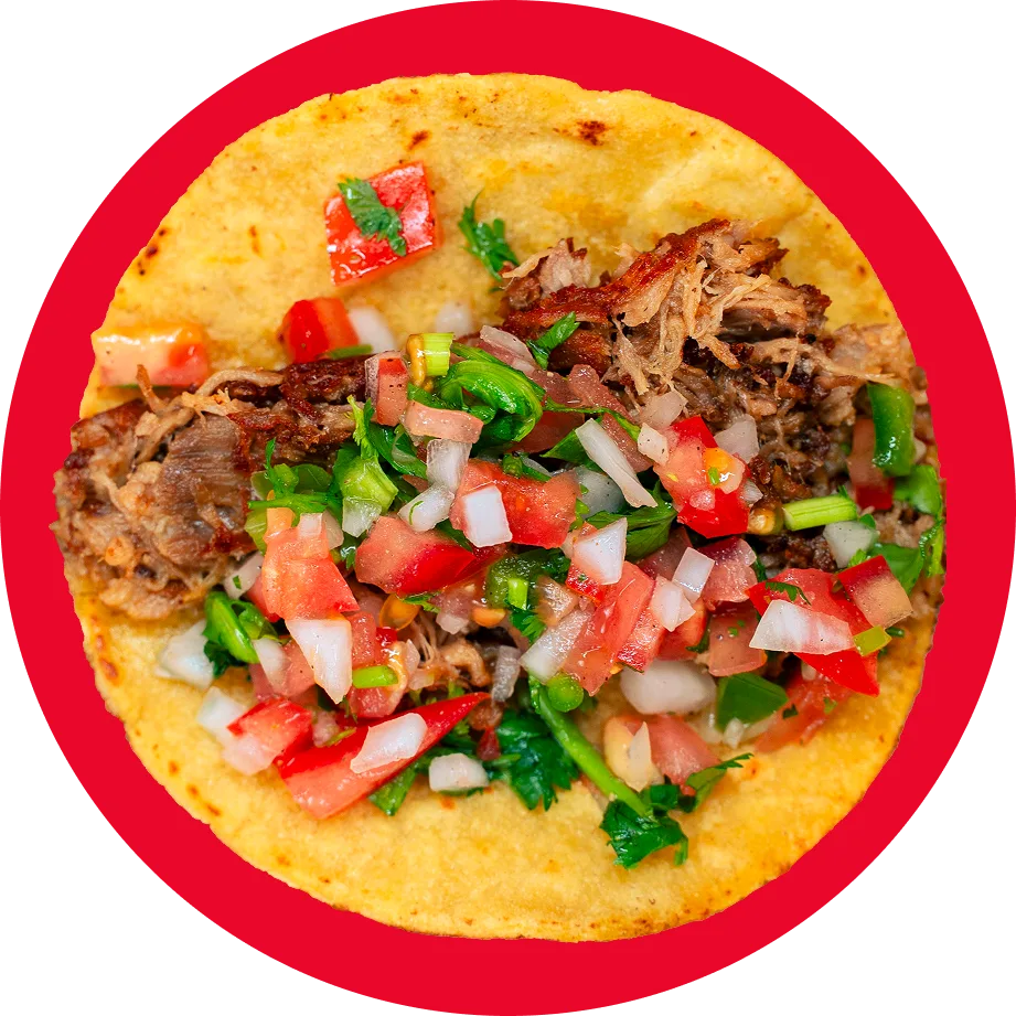 Tortilla de maíz nixtamalizado recién hecha con carne de cerdo, y revolcada en la plancha, con el imperdible famoso pico de gallo.