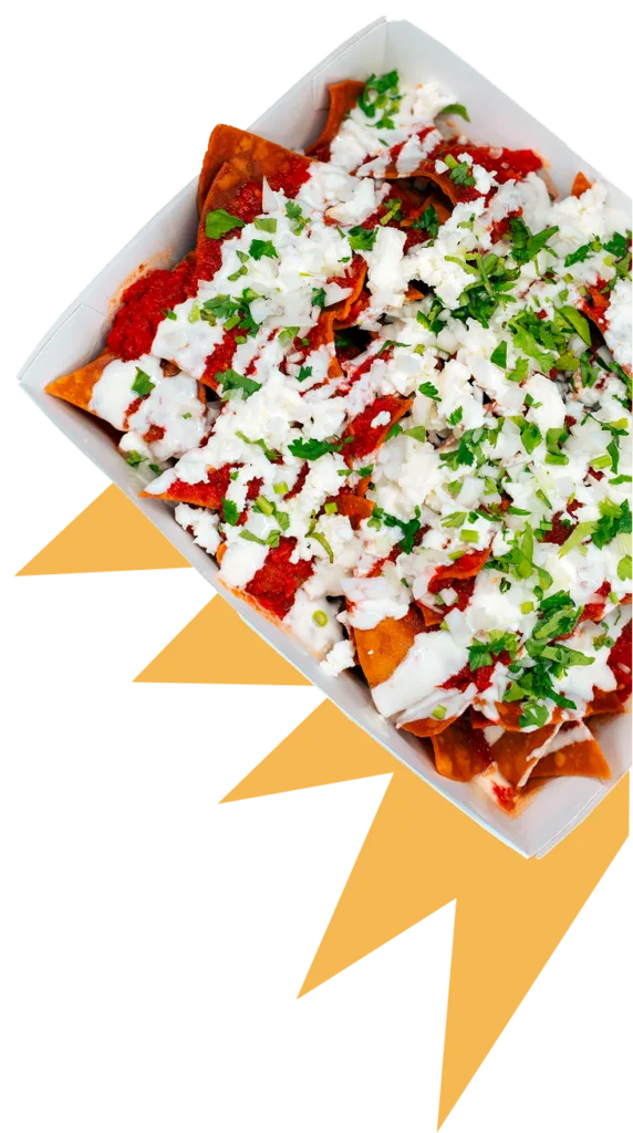 Totopos de maíz cocinados en salsa picante verde o roja, crema, queso, cebolla, cilantro