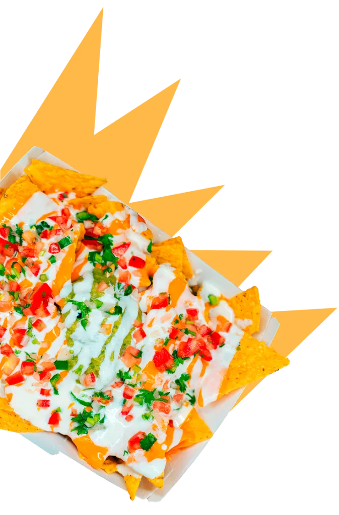 Totopo de maíz, con queso cheddar, guacamole, auténtico pico de gallo y nata acidificada.